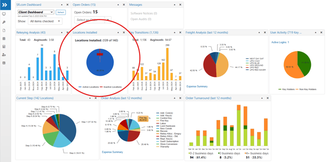 Once you've logged in, you’ll first land on the SecurityRecords Dashboard. Among other custom reports, you'll see the Locations Installed pie chart. This chart is a visual representation of all locations within the your customer database. The Active vs. Inactive Locations will summarize which locations have been installed with InstaKey, and which have not yet been converted.