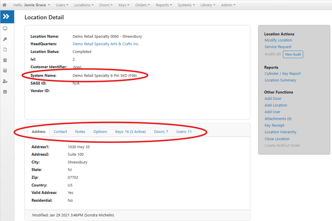 Here you can review all the details of what InstaKey has on record for that Location including: the System that is installed, the Address, Location Contact Info, Notes (when applicable), Options (administrative access only), Keys, Doors, and Users.